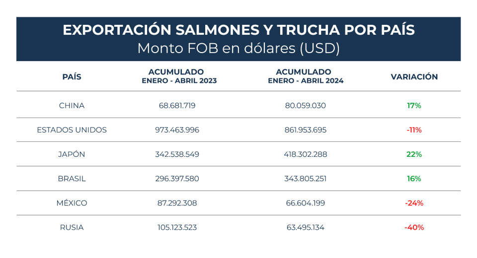 A abril de 2024, se despacharon 11.726 toneladas de salmónidos a China por un valor de US$80 millones, un 25% más en materia de volumen y un 17% más en retornos, en comparación a lo informado al mismo periodo del año pasado, cuando la exportación acumulada fue de 9.411 toneladas por US$68 millones.