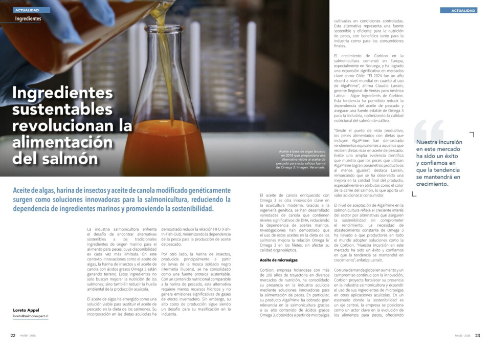 “El 2024 fue un año récord a nivel mundial en cuanto al uso de AlgaPrime. Desde el punto de vista productivo, los peces alimentados con dietas que incluyen AlgaPrime han demostrado rendimientos equivalentes a aquellos que reciben dietas ricas en aceite de pescado. Existe una amplia evidencia científica que muestra que los peces que utilizan AlgaPrime logran parámetros productivos al menos iguales. Además, hemos observado una mejora en la calidad final del producto, especialmente en atributos como el color de la carne del salmón, lo que aporta un valor adicional al consumidor”, explica Claudio Larraín, gerente regional de Ventas para América Latina de Corbion.