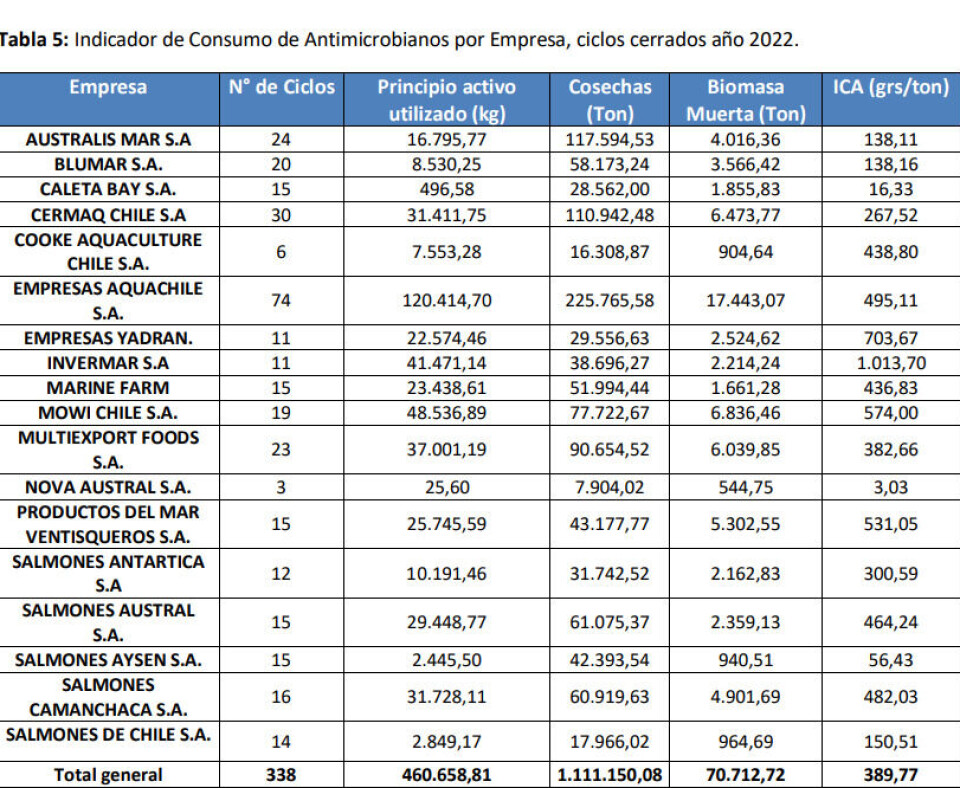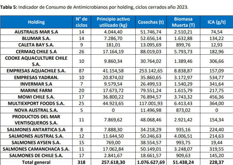 De la misma forma, respecto del consumo de antimicrobianos ciclo cerrado, que corresponde a períodos de engorda de salmónidos que terminaron su operación en el 2023, el informe dice que durante el último año el ICA fue de 228,37 g/t, lo que significa un 44,01% menos que 2022.