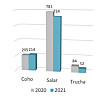 El peso de ingreso de los smolts a engorda del año 2021 se vio incrementado respecto del año anterior en dos especies: salmón Atlántico 172 gramos (+5%), salmón coho registró un peso de 342 gramos (+22%), mientras que la trucha arcoíris se mantuvo sin variaciones, con 236 gramos (0%).