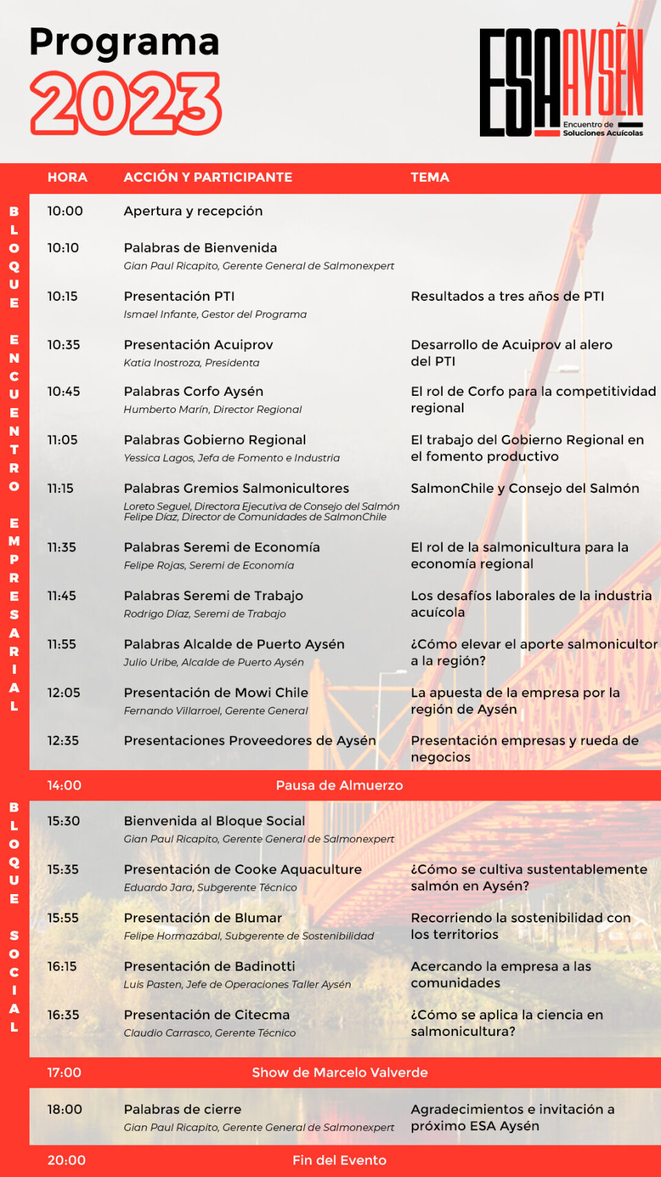 La feria de proveedores ESA Aysén 2023, Encuentro de Soluciones Acuícolas, se realizó con éxito con más de 500 asistentes, potenciando a las Pymes locales a través de 20 stands donde pudieron reunirse con productores de salmón y autoridades, además, se logró educar a estudiantes y a la comunidad sobre esta importante y creciente industria. Conoce a las 20 empresas de la Región de Aysén, que estuvieron presentes con stand el martes 1 de agosto de 2023, en el Polideportivo de Aysén.