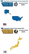 Al analizar los destinos de las exportaciones regionales a nivel de continentes y subcontinentes, en el presente período, América del Norte fue el más importante con un nivel de envíos de US$793,1 millones, equivalente a 40,2% del total. En términos de cantidad, la participación de Norteamérica fue de 31,5%. Respecto a igual período de 2016, este destino anotó un aumento de 21,9% en términos de valor, en tanto, exhibió una disminución de 14,4% en la cantidad de salmón que importó.