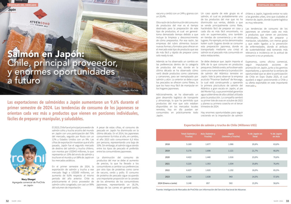 En la sección "Postales de Mercado" de la última edición de revista Salmonexpert, Nury Disegni, agregada comercial de ProChile en Japón, da a conocer que, a pesar de estas cifras, el consumo de pescado en Japón ha disminuido en la última década, sin embargo, el salmón sigue siendo entre los tipos de pescado el preferido entre los consumidores japoneses.