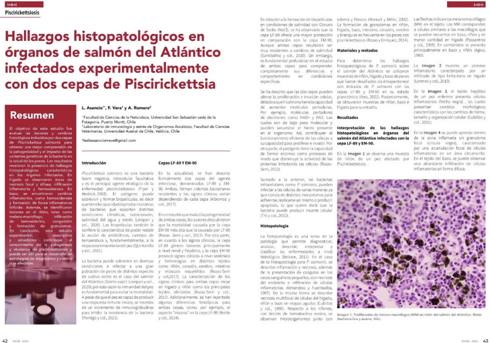 Lea el artículo “Hallazgos histopatológicos en órganos de salmón del Atlántico infectados experimentalmente con dos cepas de Piscirickettsia salmonis”, de los autores L. Asencio, F. Vera y A. Romero, en revista Salmonexpert páginas 42-47.