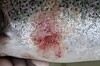 Figura 2. Se observa un ejemplar de trucha arcoíris afectados por SD, con lesiones macroscópicas eritematosas en flanco. Las lesiones se caracterizan por manchas rojas simples o múltiples bien definidas.