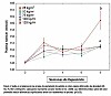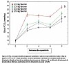 La prueba de consumo de agua En la prueba de consumo de agua, todos los grupos tuvieron una reducción en el nivel de cloruro de plasma entre la primera muestra tomada y la semana 4 (p<0,01, Fig. 3). A partir de la semana 2 y hasta el final de la prueba, el nivel de cloruro de plasma en el grupo de 0,2 l/kg peces/min fue menor que en los demás grupos (p<0,01). El nivel de PCO2 en la sangre, (mm Hg), también se vio afectado por el consumo específico de agua y por la cantidad de semanas de exposición (p<0,001, Fig. 4). En general, en todos los grupos se observó que el nivel de PCO2 fue aumentando en la medida que pasaba del tiempo (p<0,001). Este aumento fue mayor en el grupo de 0,2 l/kg peces/min, que demostró un nivel mayor que los demás grupos a partir de la semana 2 (p<0,01). El desarrollo del HCO3- en la sangre siguió el mismo esquema que el registrado para el PCO2. En la prueba de consumo de agua, los diferentes grupos de prueba no registraron ninguna diferencia en el valor de los hematocritos o en el valor de la glucosa. Los resultados del análisis de los indicadores de bienestar tampoco mostraron diferencias entre los grupos. Al comenzar, el tamaño promedio de todos los peces era de 113 g. Al finalizar, este valor había aumentado a 195 g y no se registró ninguna diferencia entre los grupos. El desarrollo de la condición física mostró el mismo patrón que el SGR, es decir, no se registraron diferencias en ninguno de los grupos.