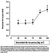 Resultados La prueba de densidad En la prueba de densidad, el sodio en el plasma se vio afectado tanto por la densidad como por la cantidad de semanas de exposición (p<0,05, Fig. 1). En todos los grupos se registró un leve aumento de Na+ en el plasma durante las primeras dos semanas de la prueba. En el periodo transcurrido entre la semana 2 y la semana 8, no se registró ningún cambio en el nivel de iones, exceptuando al grupo de 125 kg/ m3, que tuvo un aumento de Na+ en el plasma (p<0,05). Además, el grupo de 125 kg/m3 mostró un nivel más bajo de hematocritos comparado con los otros grupos de prueba (p<0,05). Lo mismo sucedió en el nivel de glucosa del plasma, que se vio afectado por la densidad y el tiempo de exposición (p<0,001). El nivel más alto de glucosa en el plasma fue registrado en el grupo 25 kg/m3, mientras que los grupos de 100 y 125 kg/m3 tenían un nivel de glucosa menor que los demás grupos (p<0,05). La prueba mostró varias diferencias en los indicadores de bienestar registrados, entre ellas, el estado de las aletas pectorales y las cataratas que fueron afectadas negativamente por la densidad mayor a 75 kg/m3 (p<0,05, Fig. 2). La medición del crecimiento durante las ocho semanas, hecha en los individuos marcados de la población, mostró una reducción en el SGR con el aumento de la densidad (Tabla 1). En el grupo de menor densidad (25 kg/m3) y en los tres grupos siguientes 50, 75 y 100 kg/m3 se registró una reducción en el SGR del 9, 15 y 5%, respectivamente. Lo mismo sucedió en los grupos de 100 y 125 kg/m3, donde se observó una reducción en el SGR del 49% durante todo del periodo de prueba (0-8 semanas). Si se calcula el SGR sobre la base de toda la biomasa del estanque durante estos dos periodos (0-4, 4-8, Tabla 1), la reducción en la tasa de crecimiento, debido al aumento de densidad, fue evidente en todos los grupos de prueba, comparado con 25 kg/m3 durante las primeras cuatro semanas. Sin embargo, entre las semanas 4-8, la tasa de crecimiento se redujo en los grupos de 25 kg/m3 y 125 kg/m3 comparados con los demás grupos (p<0,05, Tabla 1). Si se calcula todo el periodo de prueba (0-8 semanas), no hubo ningún cambio significativo en el aumento de la biomasa en los grupos entre 25, 50 y 75 kg/m3, mientras que el aumento de biomasa fue significativamente menor en el grupo de 125 kg/m3, que además tuvo menor eficiencia de conversión alimenticia con respecto de los demás grupos (p<0,05, Tabla 1).